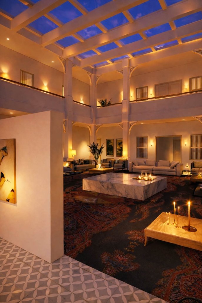 Le cœur du projet s’articule autour d’un vaste atrium sur plusieurs niveaux, baigné de lumière naturelle grâce à une verrière généreuse. Cette architecture verticale offre une perception immédiate de grandeur tout en conservant une lecture fluide et apaisée des volumes.