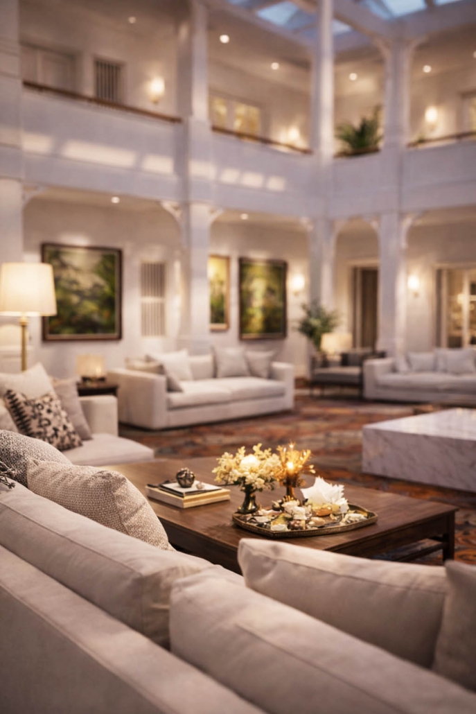La lumière joue un rôle central dans ce salon de réception privé VVIP à Doha. En journée, la lumière naturelle diffuse met en valeur l’architecture et les œuvres d’art. En soirée, un éclairage artificiel soigneusement scénographié crée une ambiance feutrée et sophistiquée, parfaitement adaptée aux réceptions de prestige.